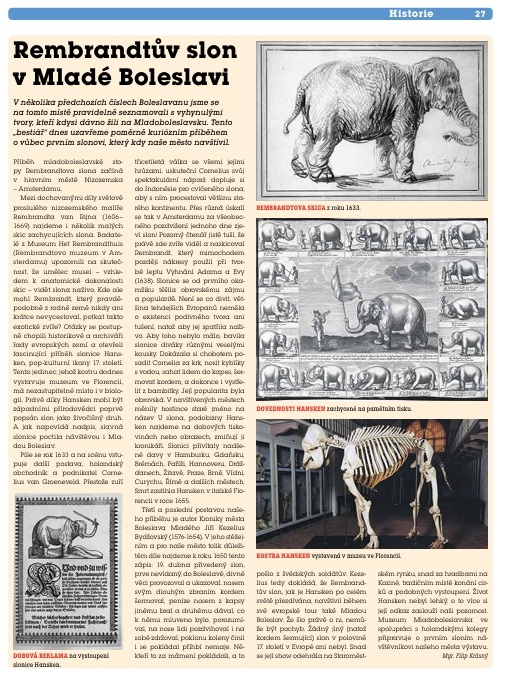 1) “19. Aprilis privedeny slon, prve nevidany, do Boleslave, divné veci provozoval a ukazoval, nosem svym dlouhym zbrani kordem sermoval, penize nosem z kapsy jinému bral a druhému dával, co k nemu mluveno bylo, porozumival, na nose lidi pozdvihoval i na sobe zdrzoval, poklonu koleny cinil i se pokladal prihbi nemaje. Nekteri to za mameni pokladali a to poslo z svedskych soldatuv.”