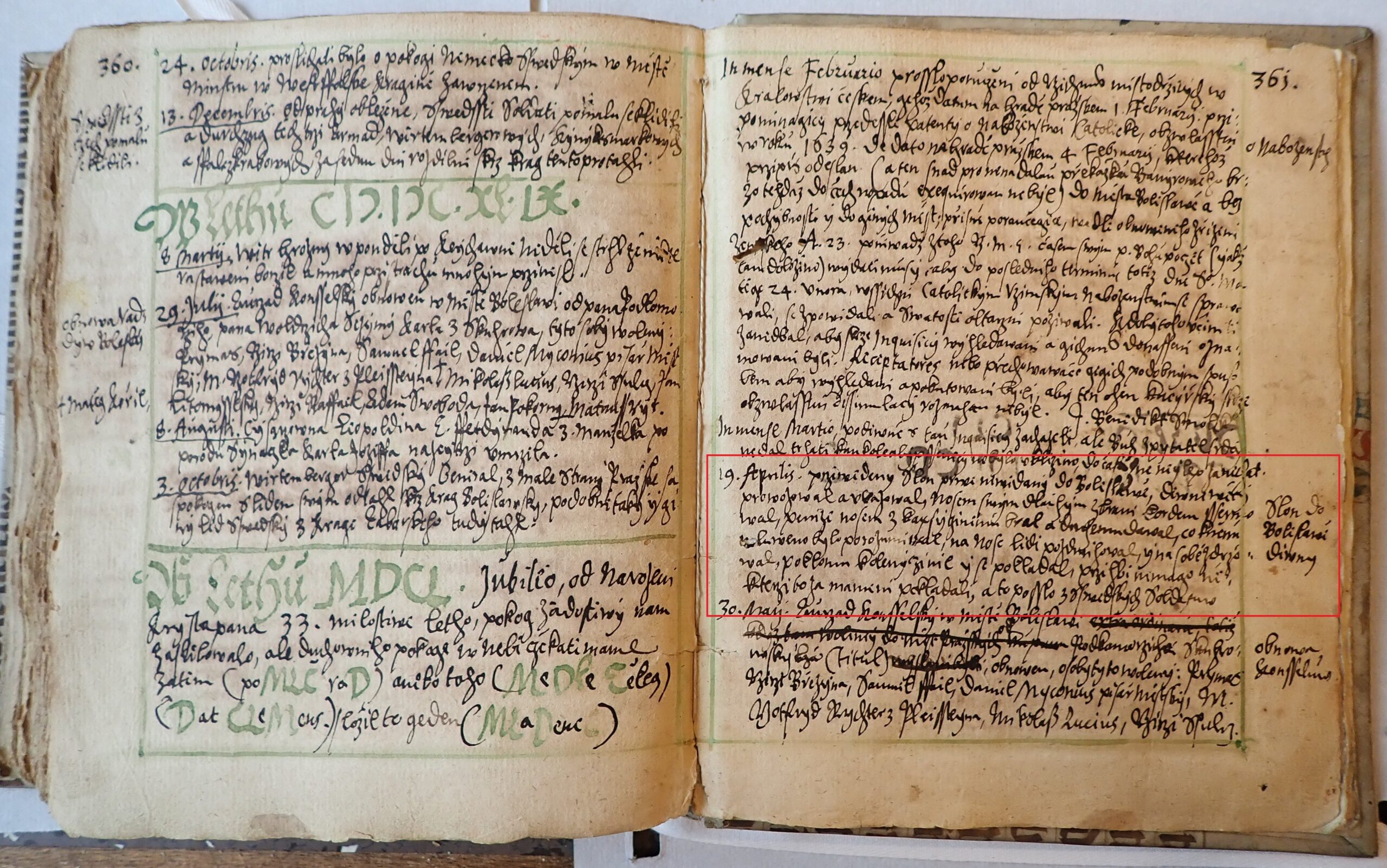 Uit: Z. Kamper (ed.), Kronika Mladoboleslavka, 1935, pp. 249-250. (Vertaling: 19 april bracht een olifant naar Boleslav nooit eerder [hier] gezien. Hij deed en toonde vreemde dingen. Met zijn lange neus vocht hij met een degen. Hij nam met zijn neus geld uit de zak van iemand en gaf dat aan een ander. Wat hem gezegd werd, begreep hij. Hij tilde mensen op zijn neus en liet ze een tijdje op hem. Met zijn knieën maakte hij een knik en boog, zonder probleem. Sommigen dachten dat het een teken was en dat hij door de Zweedse soldaten gestuurd was.)